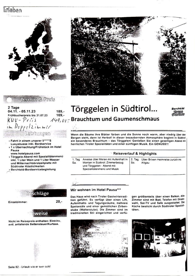 Der Ausflug geht zum Törggelen nach Montan in Südtirol (genaue Beschreibung anbei). Wir haben beim Veranstalter Berchtold Reisen 30 Plätze reserviert. Die Kosten betragen pro Person 149,00 €. Die Plätze werden wir nach Eingang der Zahlung auf dem Vereinskonto vergeben. Sollten sich mehr als 30 Mitglieder melden, werden wir versuchen noch weitere Plätze zu reservieren, dazu muss aber die Zahlung von Vereinsmitgliedern bis 31.05.2023 eingegangen sein.
